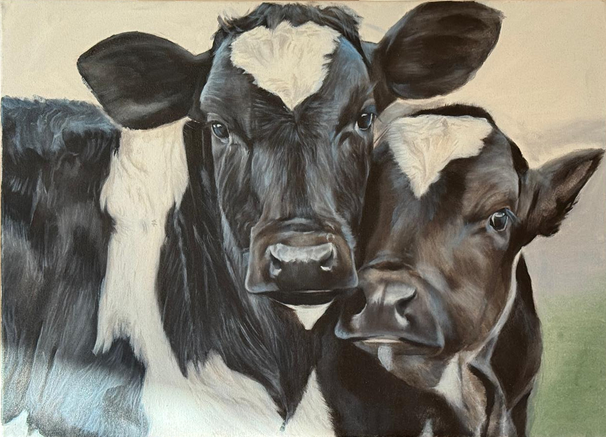 En esta obra, la artista capta con refinada sensibilidad el vínculo entre dos vacas que comparten un mismo espacio visual y afectivo. A través de una pincelada suelta pero precisa, logra conferir expresividad a las miradas y textura al pelaje, revelando una profunda empatía hacia el mundo animal. La composición cercana y el uso de una luz cálida generan una atmósfera de quietud y ternura que trasciende lo meramente figurativo, invitando a contemplar la nobleza y serenidad de los seres que habitan el paisaje rural.