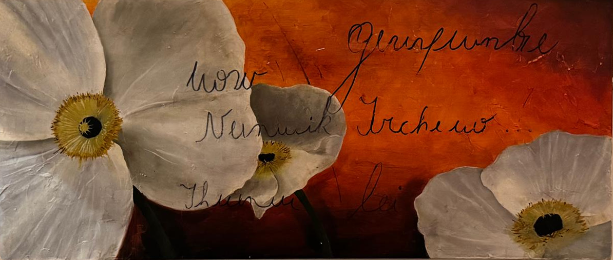 En esta obra, la tensión entre la escritura y la imagen floral genera una poética visual cargada de misterio. Las flores blancas, delicadas y etéreas, contrastan con la caligrafía oscura que se despliega sobre un fondo incandescente. La pieza invita a reflexionar sobre la memoria y la comunicación: las palabras escritas parecen flotar entre lo visible y lo intangible, como ecos de una correspondencia perdida.