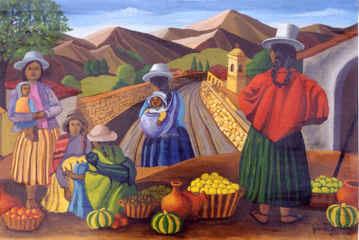 Esta pintura constituye un testimonio visual de la vida cotidiana andina. Varias mujeres —coyas— se reúnen en un mercado de altura, rodeadas de montañas, frutas y cerámicas. La artista articula el espacio mediante una perspectiva ascendente y un cromatismo terroso, logrando una atmósfera cálida y vibrante. Cada figura, envuelta en sus mantas coloridas, transmite una sensación de comunidad y pertenencia. La obra no sólo retrata una escena costumbrista, sino que celebra la identidad colectiva, la memoria ancestral y la dignidad del trabajo femenino.