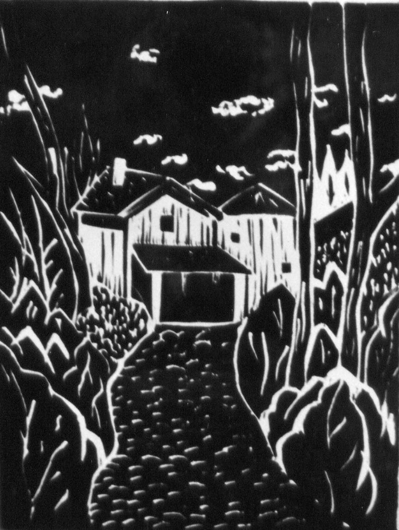 En esta obra, la artista explora la síntesis expresiva de la forma a través del grabado en linóleo, técnica que permite un fuerte contraste entre luces y sombras. Las líneas enérgicas y el juego de blancos y negros otorgan al paisaje un carácter atemporal, casi onírico. La composición —centrada en el camino que conduce hacia una vivienda rural— invita al espectador a recorrer visualmente el espacio, evocando una sensación de quietud y aislamiento. La simplificación geométrica de los volúmenes y la tensión entre figura y fondo revelan una mirada moderna sobre el paisaje tradicional.