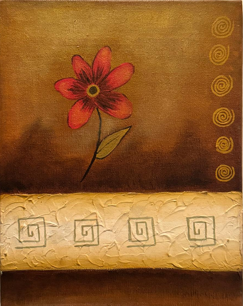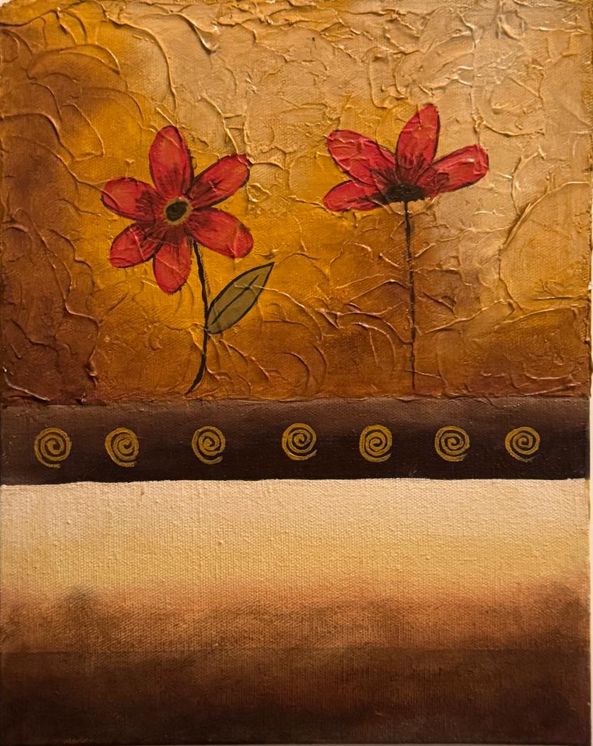 En este díptico, la artista logra una exquisita síntesis entre lo decorativo y lo poético. Las flores, delineadas con trazo delicado sobre un fondo de tonos terrosos y dorados, emergen como símbolos de vitalidad en medio de la quietud del espacio pictórico. El tratamiento matérico —a través de una textura cuidadosamente modelada en relieve— introduce una dimensión táctil que refuerza el carácter artesanal de la obra.