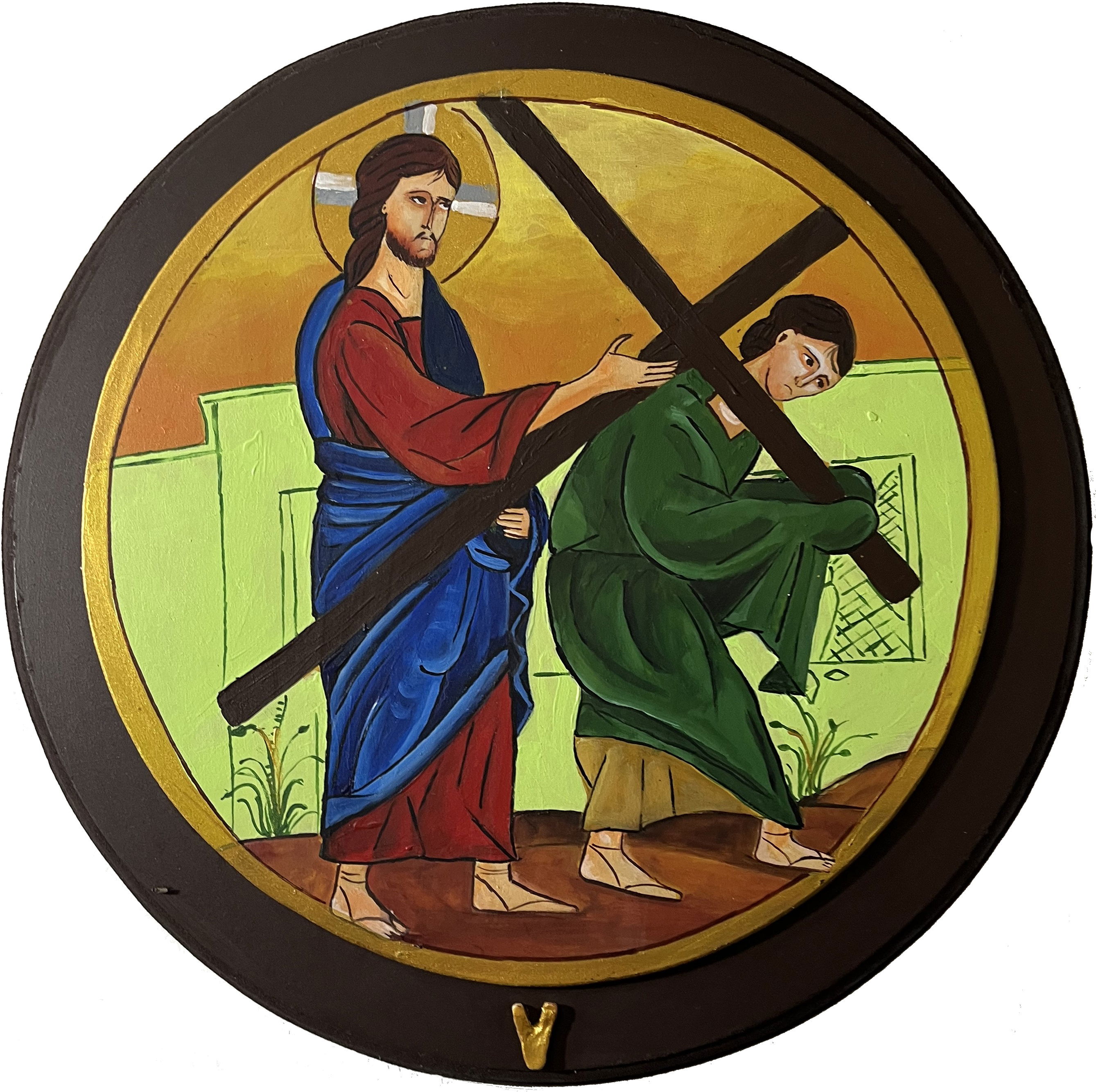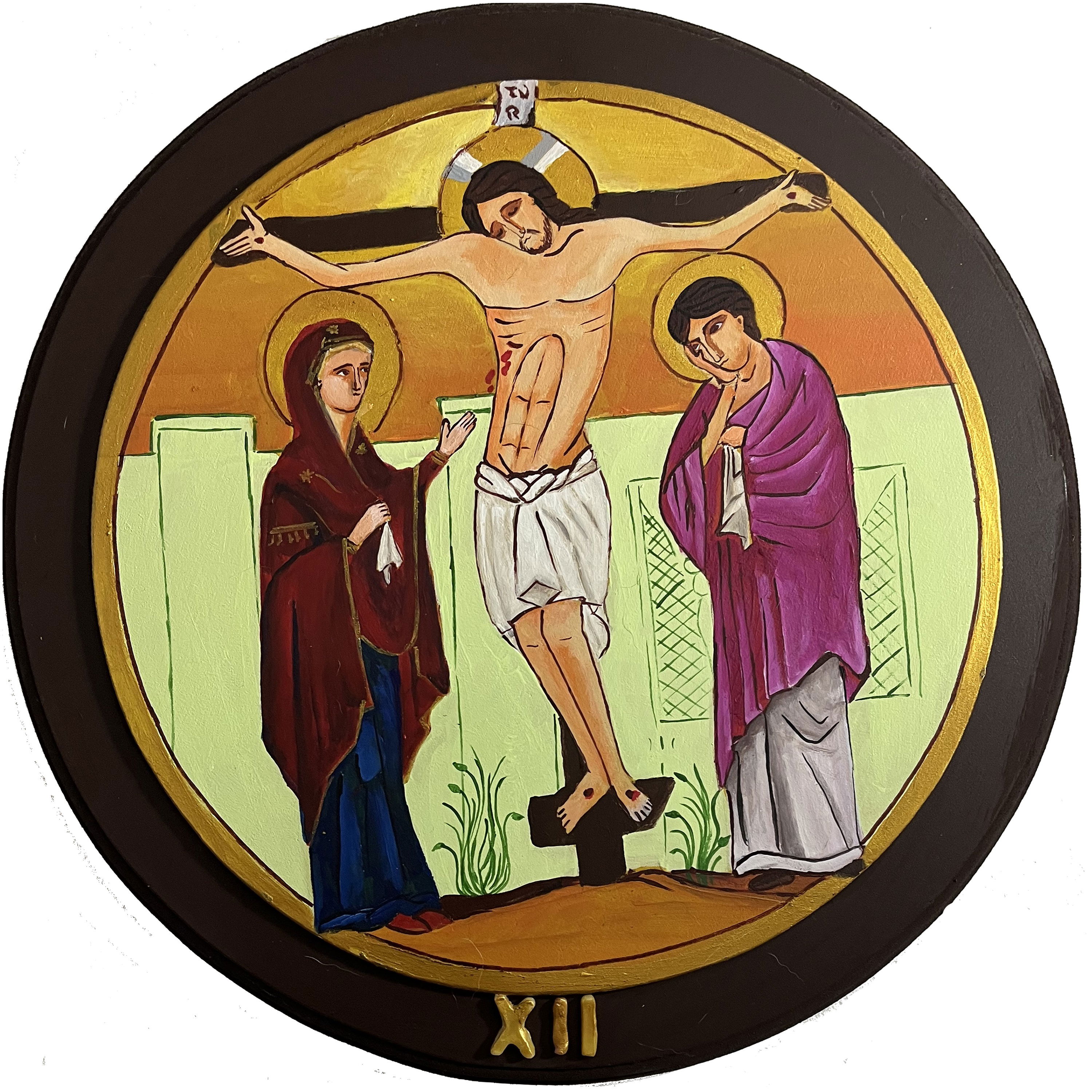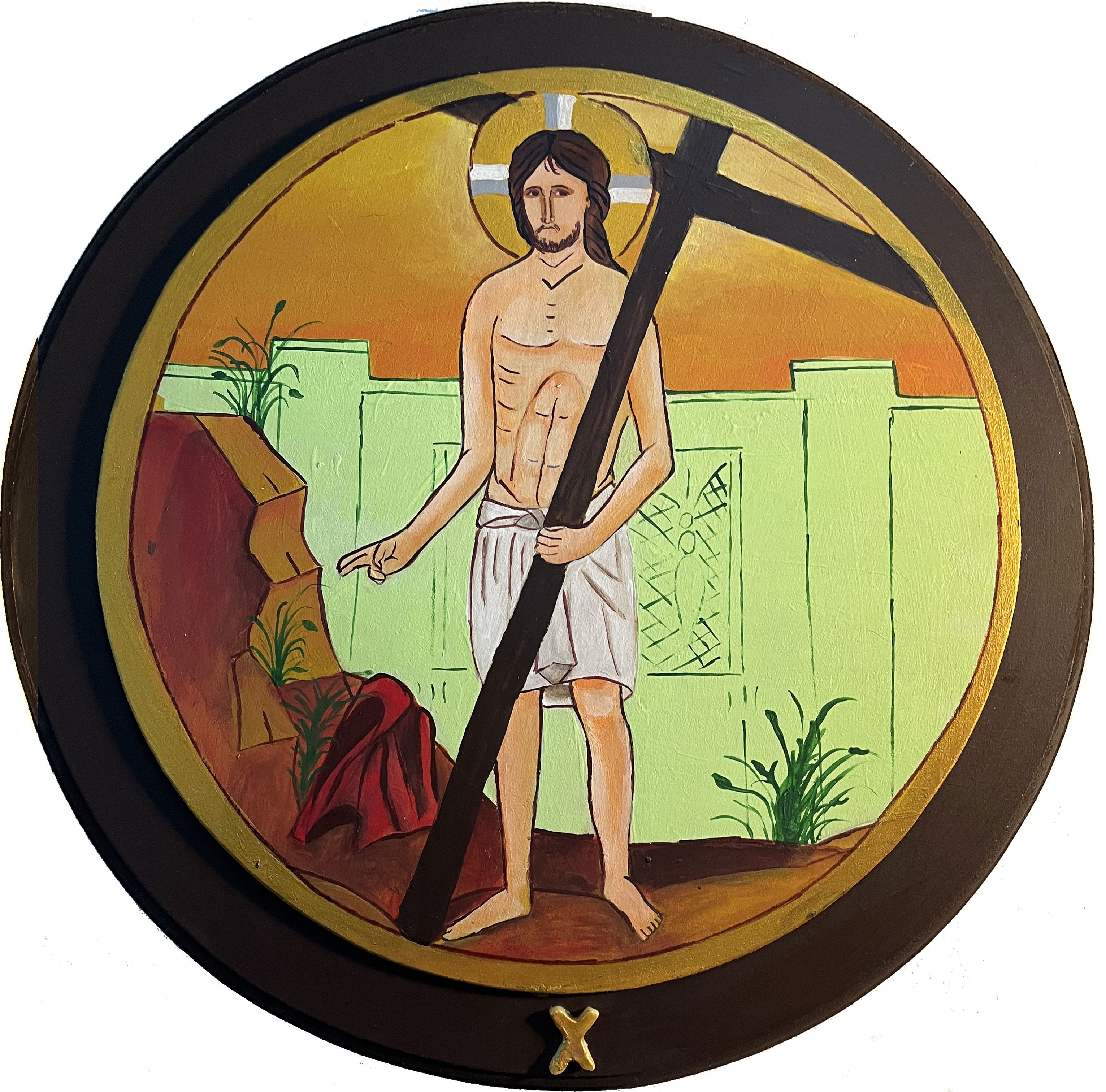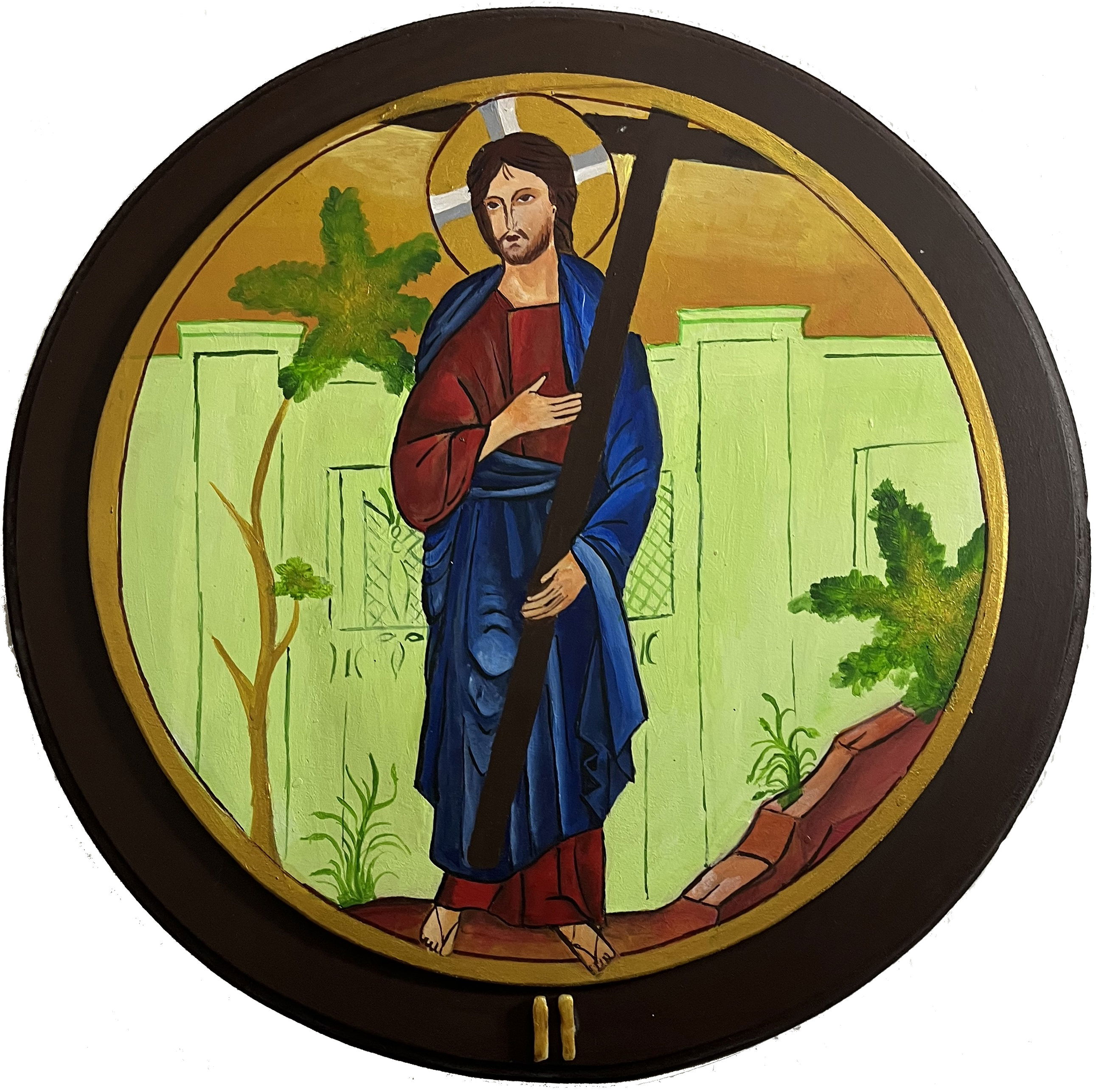 Esta serie de catorce obras circulares representa con notable coherencia plástica y espiritual las Estaciones del Vía Crucis. Cada escena, cuidadosamente construida en torno a una composición simétrica y un cromatismo simbólico, combina la solemnidad de la iconografía bizantina con un tratamiento moderno del color y la línea. Los fondos dorados y verdes evocan la trascendencia y la esperanza, mientras que los gestos serenos de las figuras invitan a una lectura contemplativa del sufrimiento y la redención.