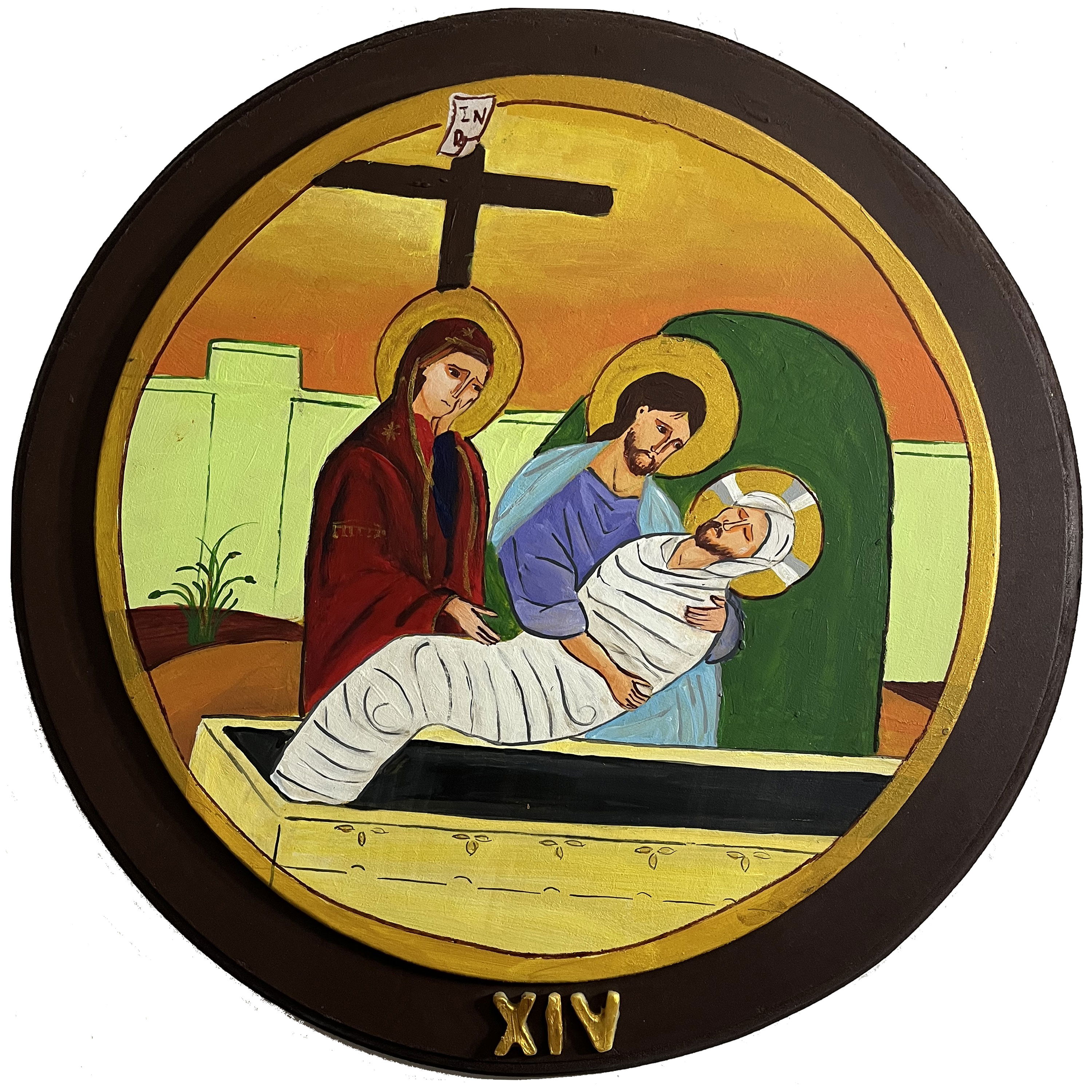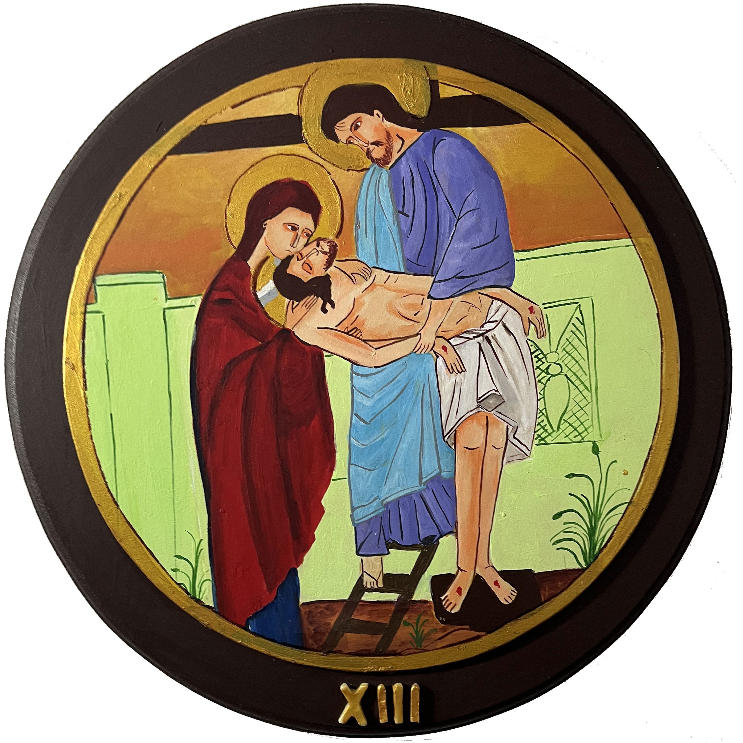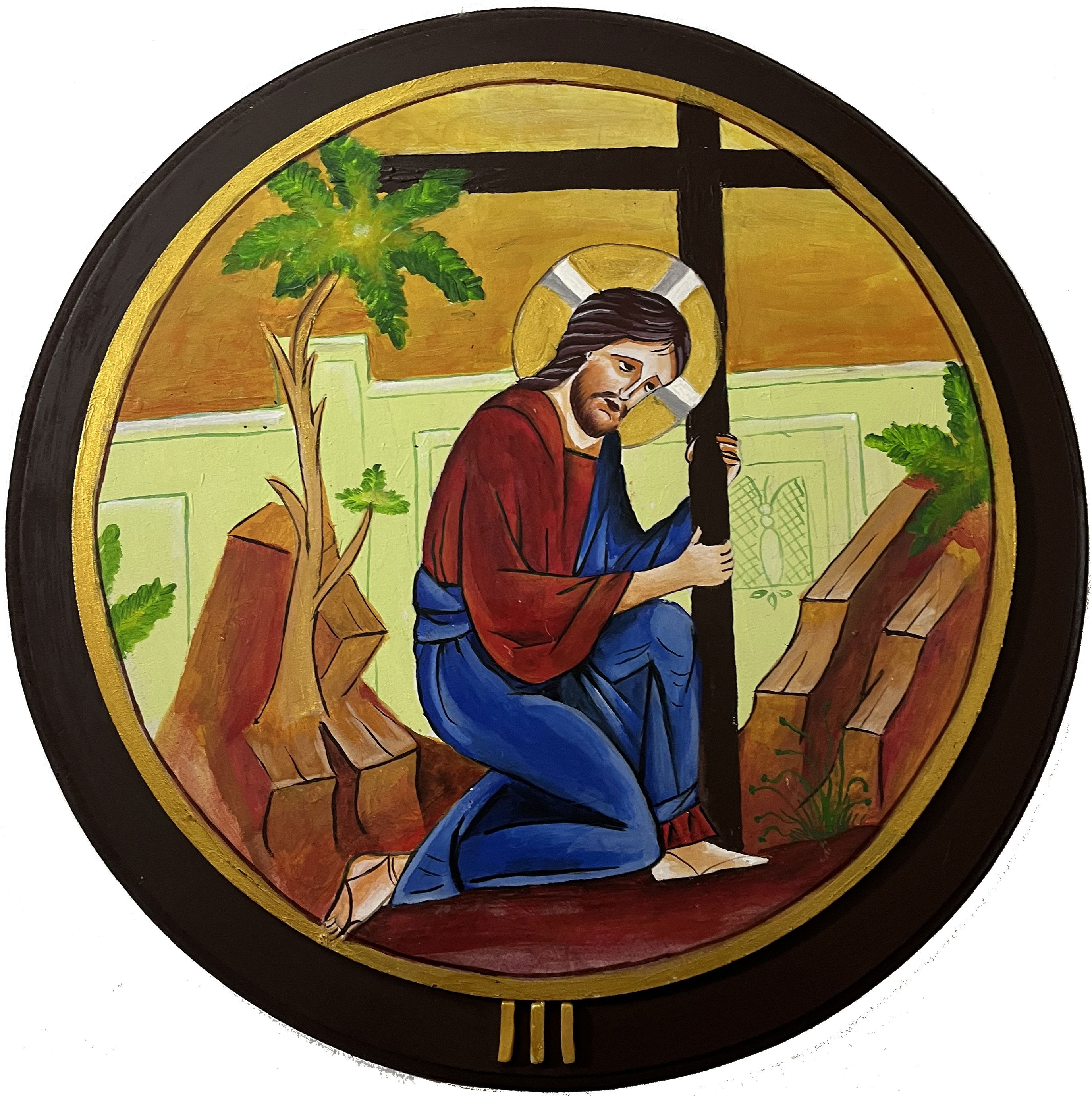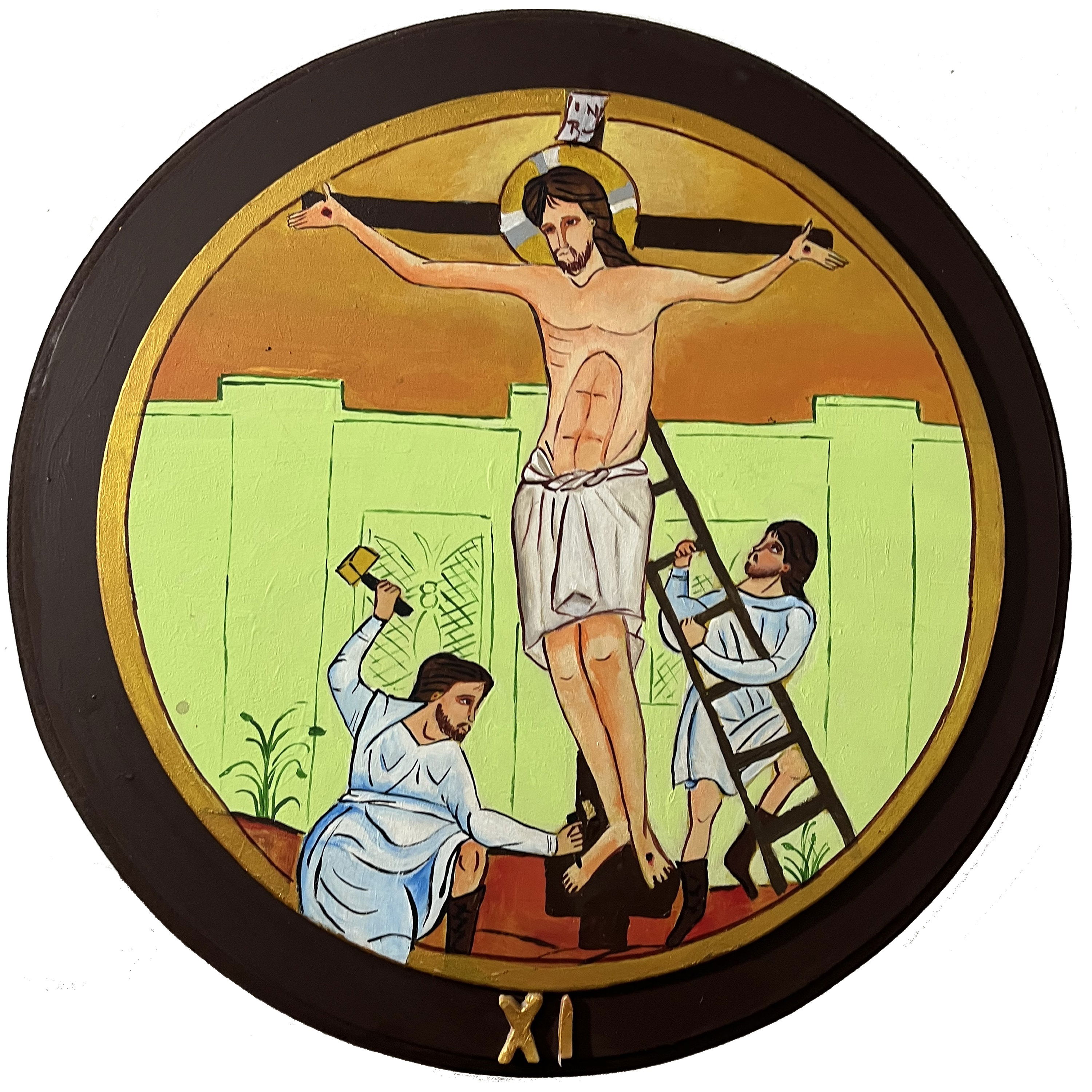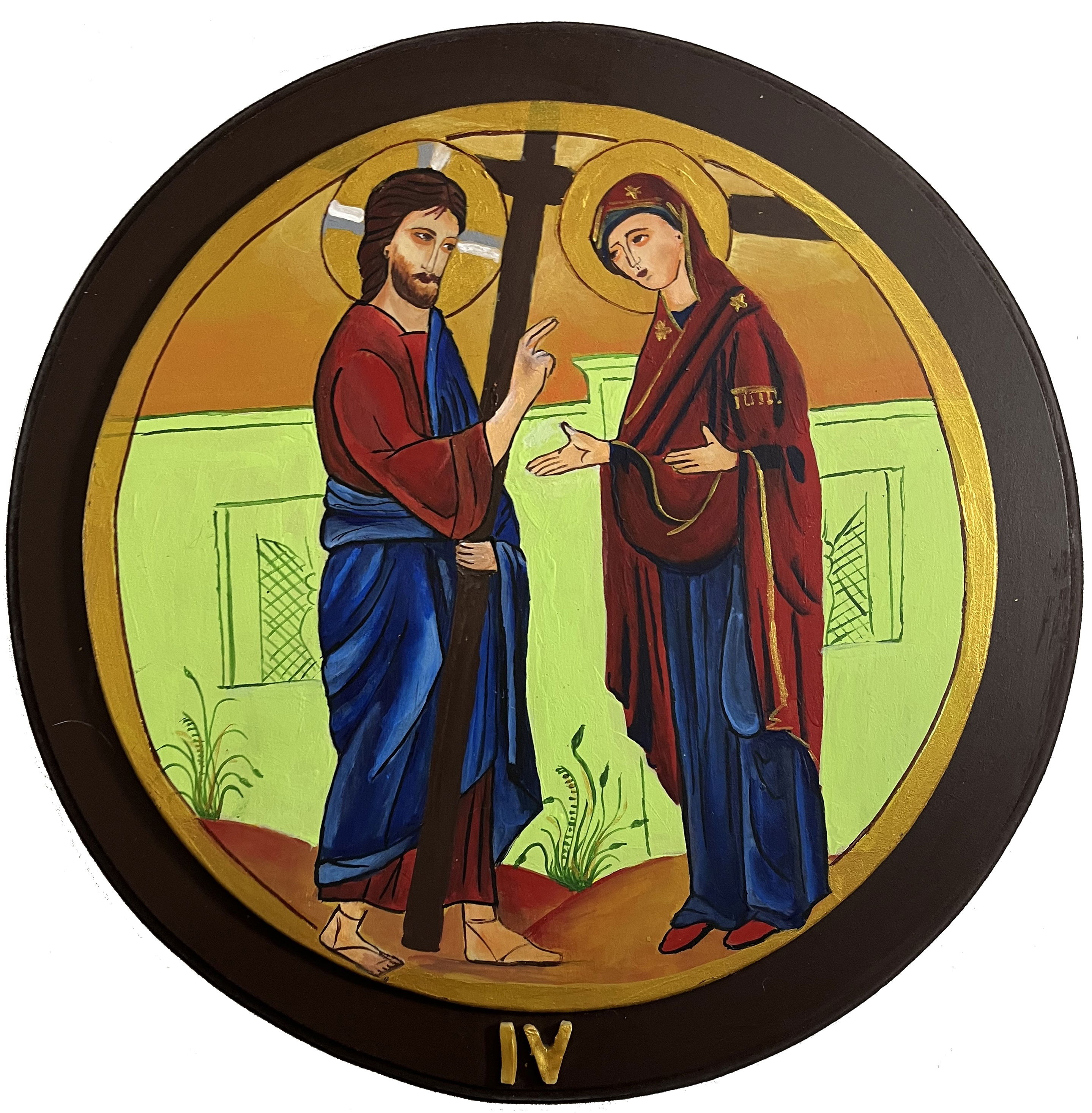 Esta serie de catorce obras circulares representa con notable coherencia plástica y espiritual las Estaciones del Vía Crucis. Cada escena, cuidadosamente construida en torno a una composición simétrica y un cromatismo simbólico, combina la solemnidad de la iconografía bizantina con un tratamiento moderno del color y la línea. Los fondos dorados y verdes evocan la trascendencia y la esperanza, mientras que los gestos serenos de las figuras invitan a una lectura contemplativa del sufrimiento y la redención.