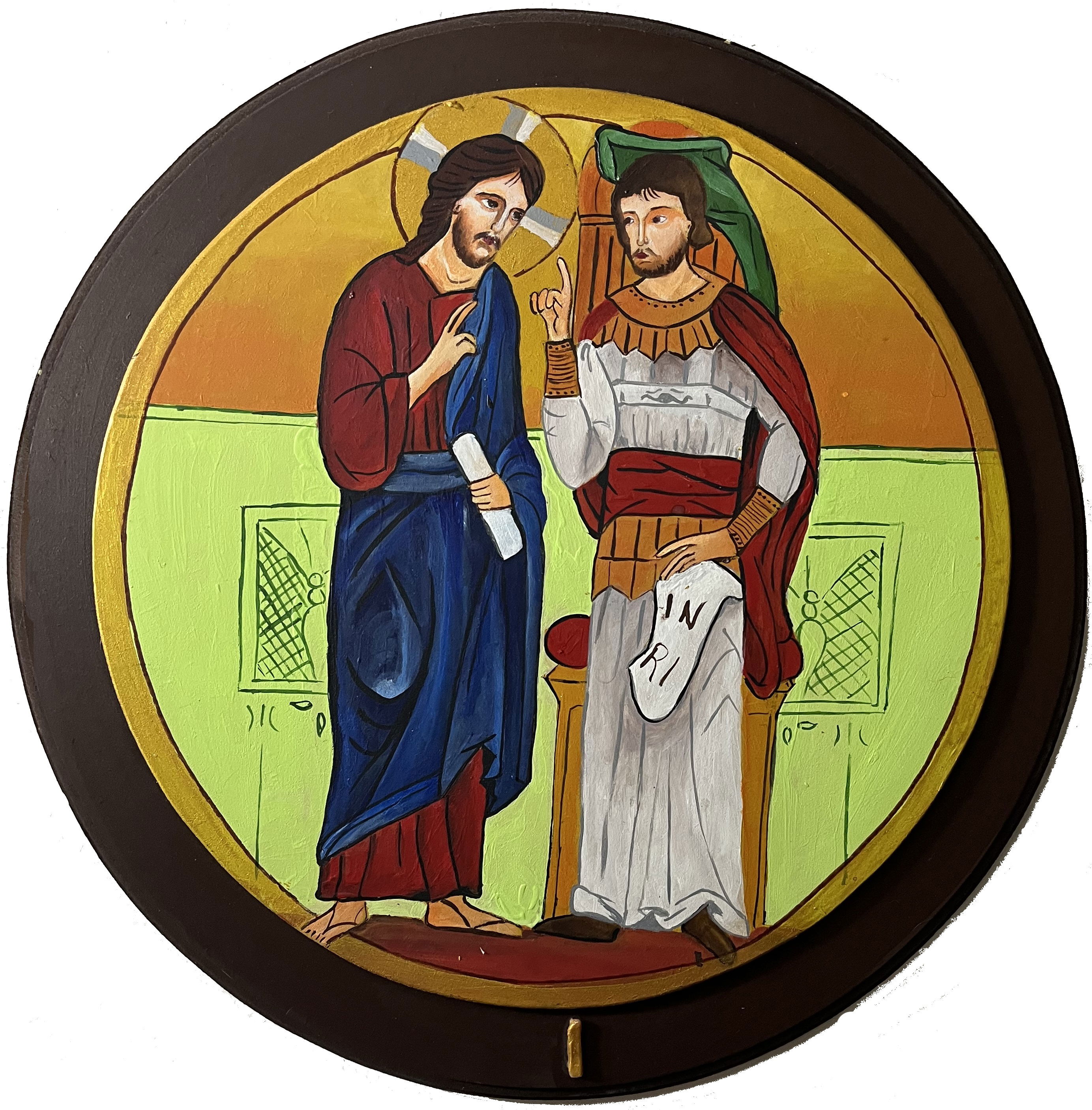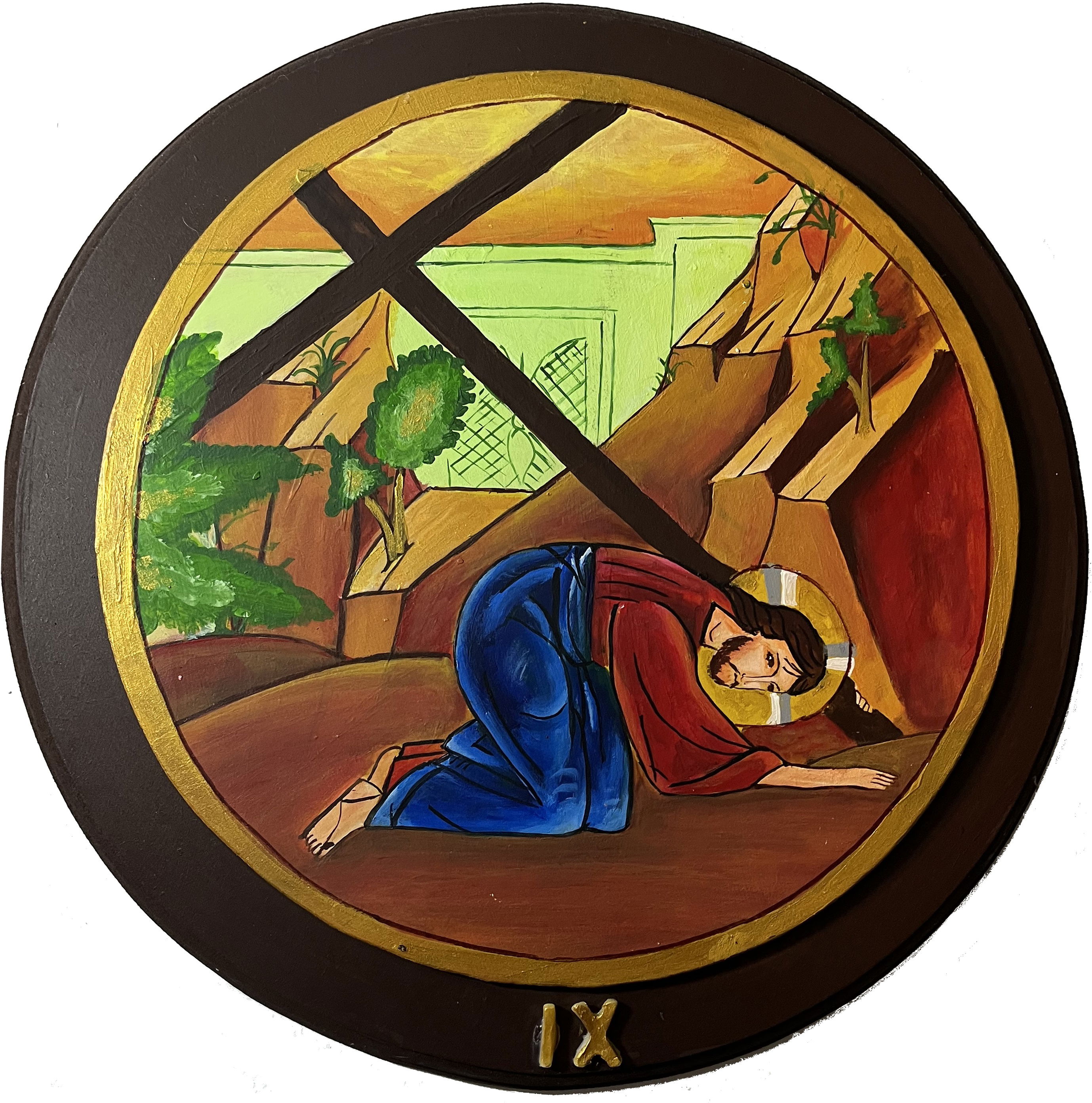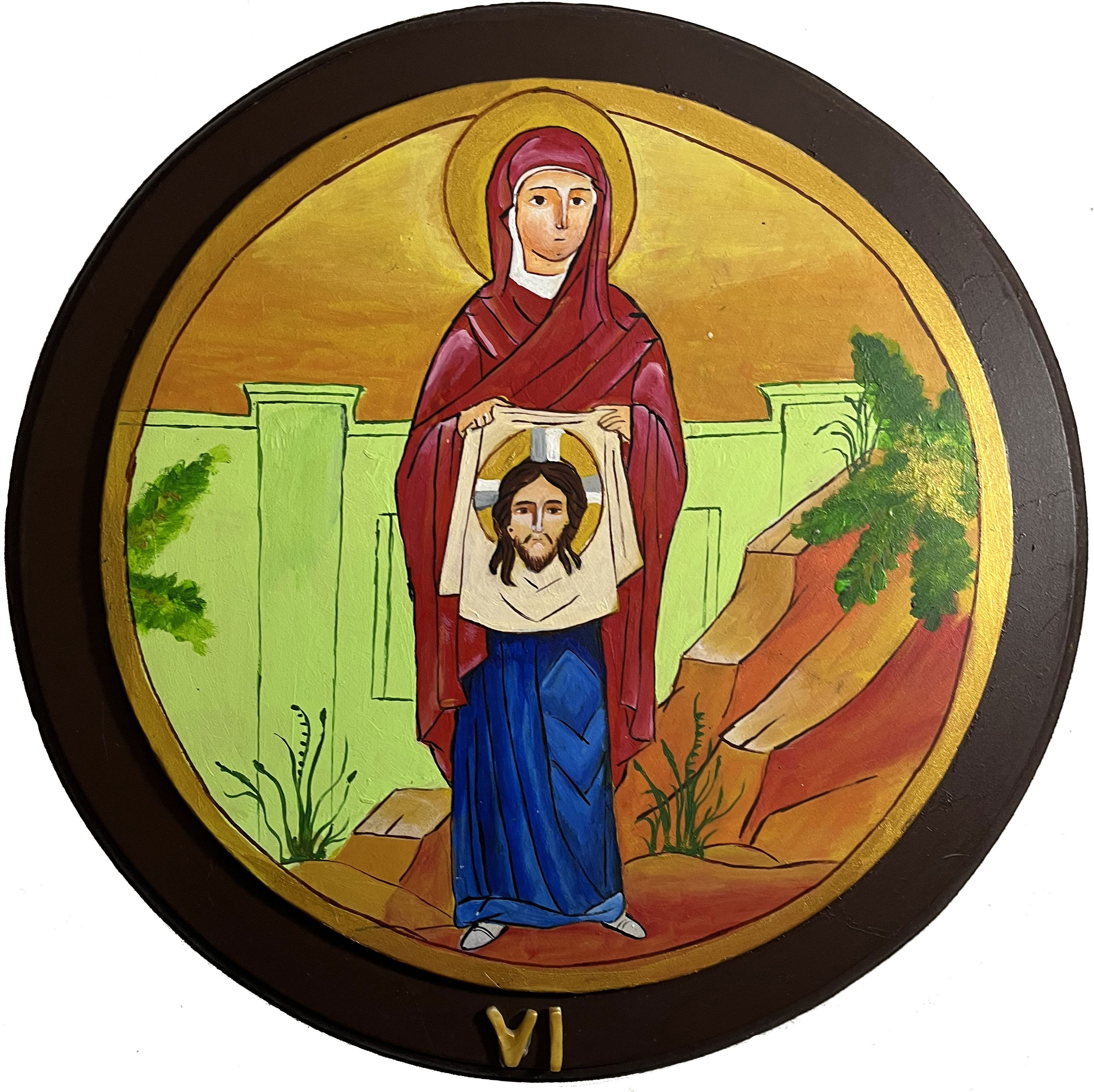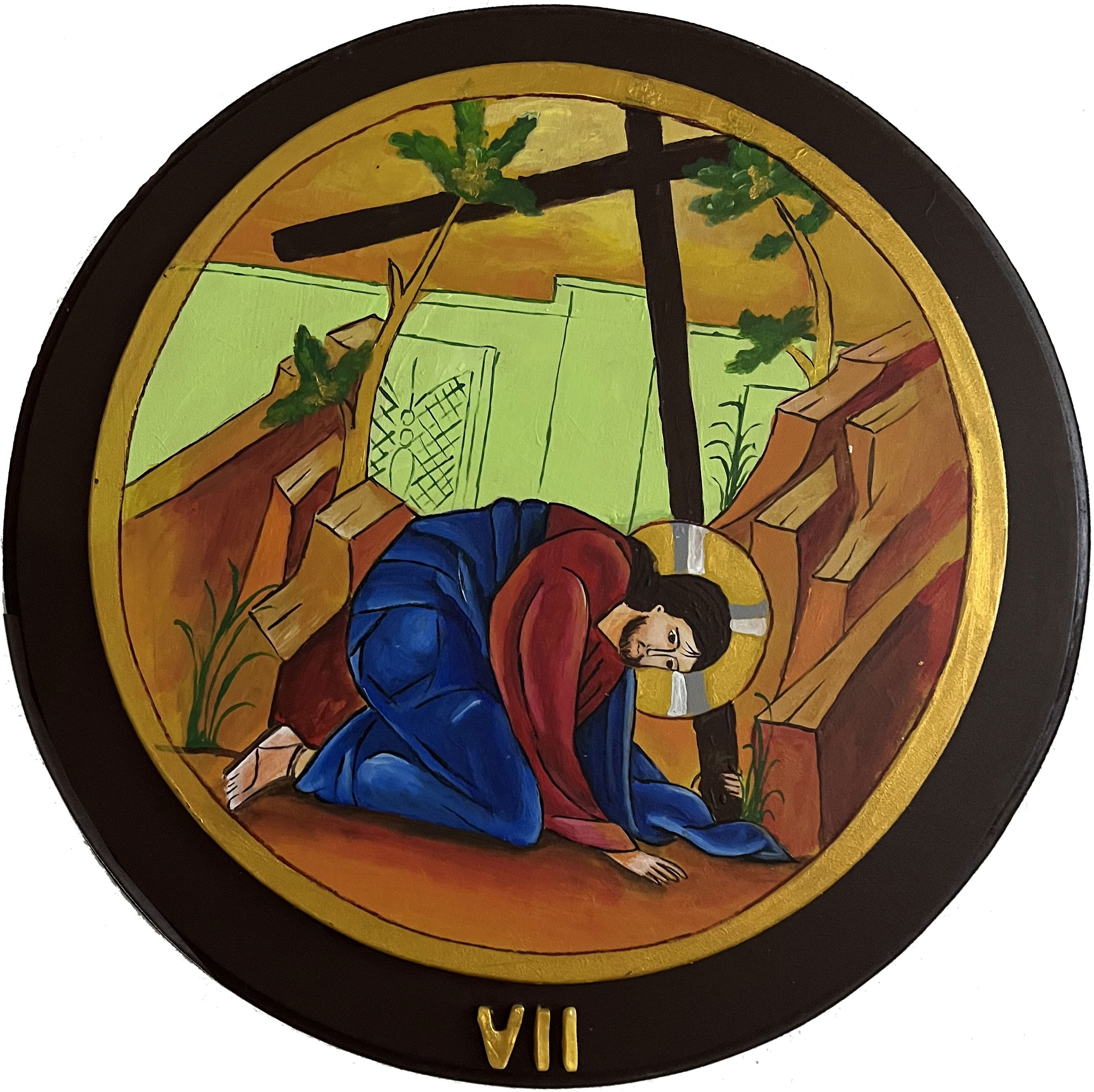 Esta serie de catorce obras circulares representa con notable coherencia plástica y espiritual las Estaciones del Vía Crucis. Cada escena, cuidadosamente construida en torno a una composición simétrica y un cromatismo simbólico, combina la solemnidad de la iconografía bizantina con un tratamiento moderno del color y la línea. Los fondos dorados y verdes evocan la trascendencia y la esperanza, mientras que los gestos serenos de las figuras invitan a una lectura contemplativa del sufrimiento y la redención.