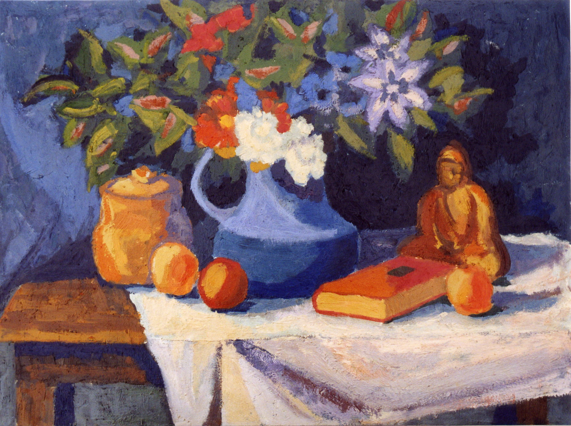 El equilibrio compositivo domina esta naturaleza muerta donde objetos cotidianos —un libro, frutas, un florero— coexisten con la figura humana simbólica. La paleta armónica de azules, naranjas y ocres revela una clara influencia postimpresionista. La artista construye el espacio mediante pinceladas densas y expresivas, generando una atmósfera de introspección. La obra celebra la serenidad del instante doméstico y la convergencia entre lo humano y el entorno.