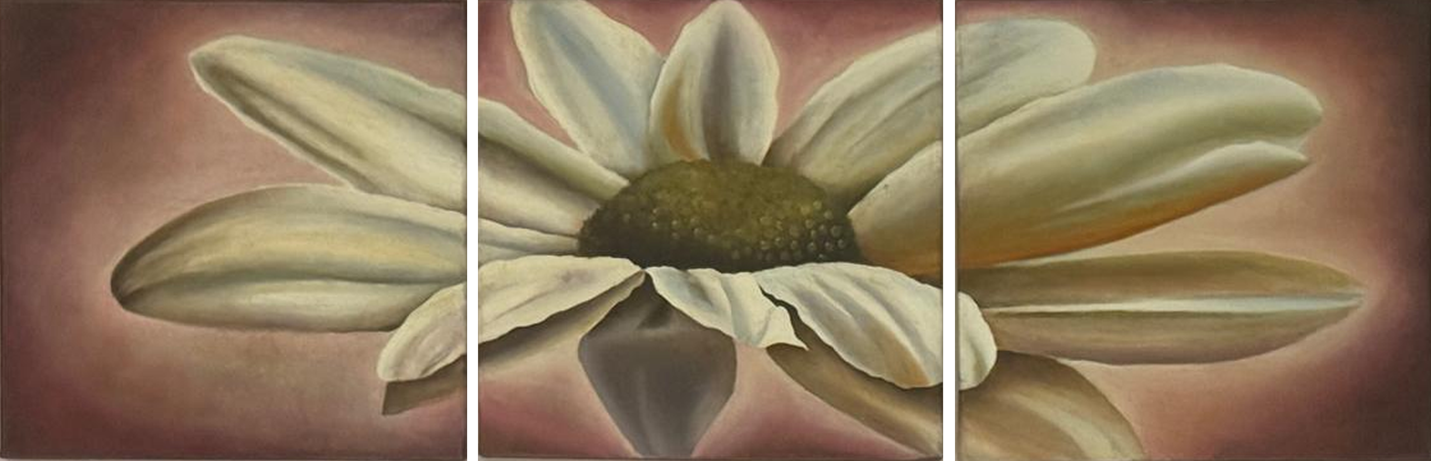 Con un enfoque casi fotográfico, esta obra aísla la figura de una margarita para explorar su monumentalidad. La flor ocupa toda la superficie, revelando los matices del blanco y la sutileza de las sombras que definen sus pétalos. La escala fragmentada en tres paneles otorga dinamismo y una sensación de expansión más allá del marco. La artista utiliza una paleta contenida, donde los fondos en degradé rosado-violeta aportan calidez y profundidad emocional. Es un ejercicio de observación minuciosa que transforma un motivo sencillo en un ícono de pureza y vitalidad.