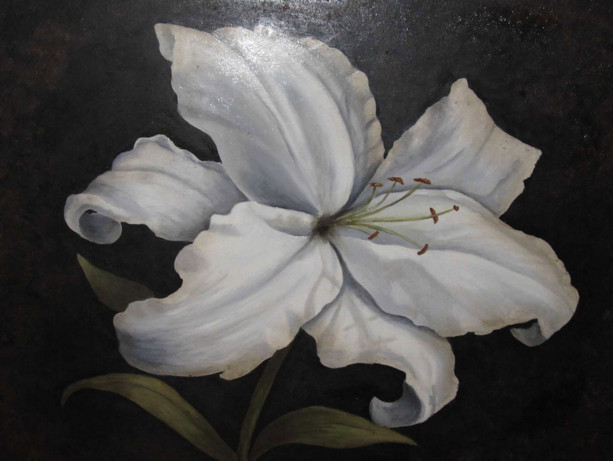 El lirio, símbolo de pureza y espiritualidad, se convierte aquí en protagonista absoluto. La flor, minuciosamente trabajada con luces frías y transparencias, se recorta sobre un fondo oscuro que acentúa su dramatismo. La composición, casi barroca en su contraste lumínico, revela una sensibilidad que combina la precisión del naturalismo con la emotividad del claroscuro. El lirio no es sólo un motivo decorativo, sino una metáfora de lo efímero y lo sublime, una meditación visual sobre la fragilidad de la belleza.